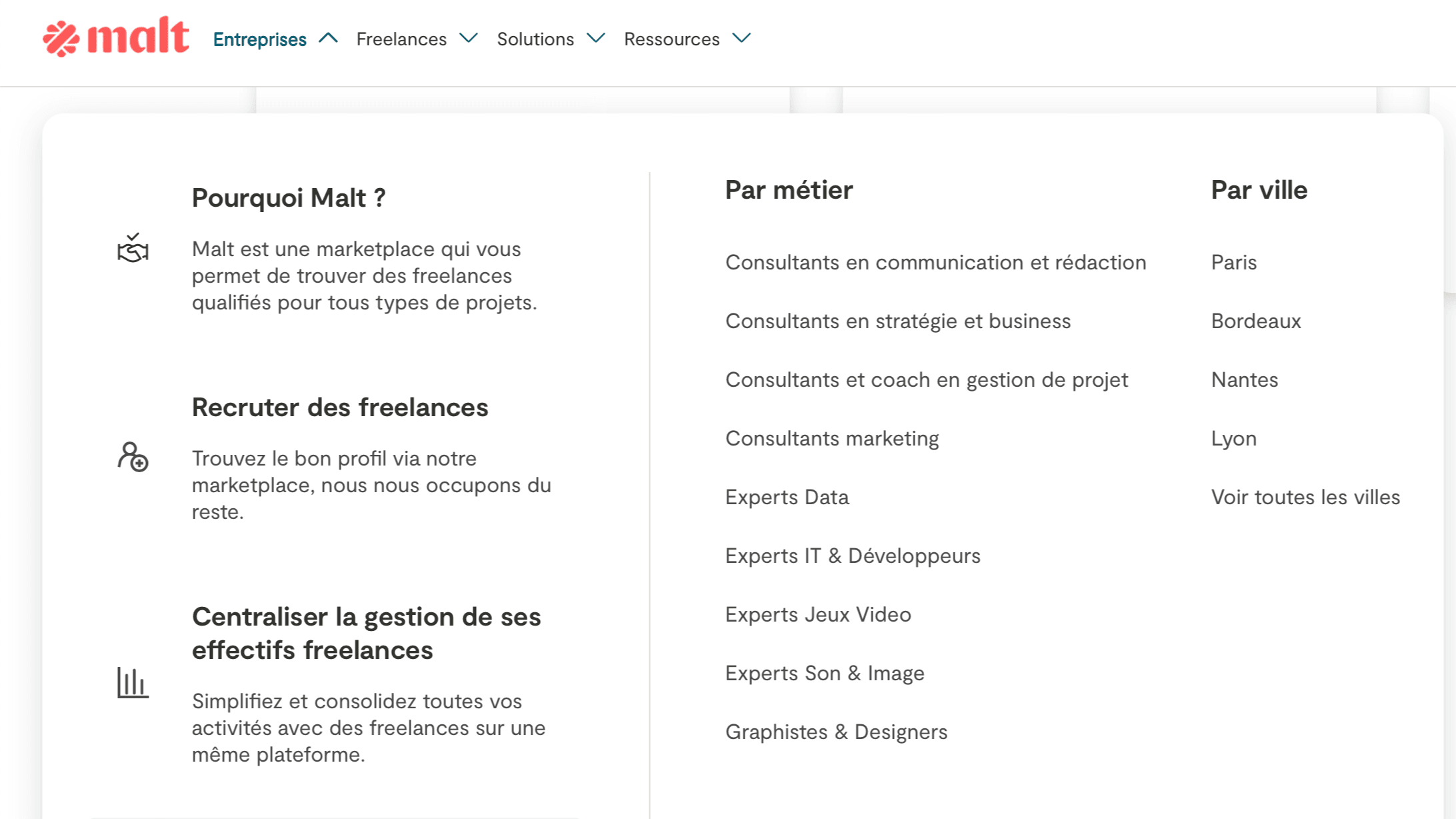 Malt est une plateforme française populaire qui met en relation des freelances avec des entreprises ou personnes à la recherche de prestataires spécifiques. Vous pouvez y trouver des freelances spécialisés dans la création de sites web, avec des compétences variées telles que le développement front-end, le développement back-end, mais aussi des profils axés sur le design web, le SEO, le CRM, et bien plus encore.